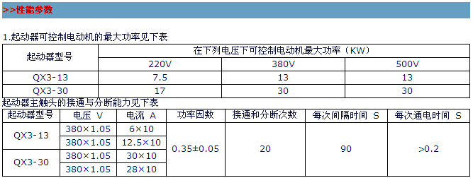 QX3系列星三角起動器(以下簡稱起動器),主要供交流50或60HZ,電壓至500V,容量至30KW的三相鼠籠型感應(yīng)電動機作星三角換接起動及停止之用。起動器在起動過程中,通過時間繼電器能自動將所控制的電動機定子繞組有星形聯(lián)接起動后換接至三角形聯(lián)接起動器帶有熱繼電器作為過載保護,其接觸器呢感在電網(wǎng)電壓消失時兼作失壓保護。 適用范圍及工作條件 1.周圍空氣濕度:I限值不超過+40℃,I限值不低于-25℃,24小時內(nèi)的平均值不超過+35℃。 2.安裝地點的海拔不超過1000M。 3.大氣相對濕度在周圍空氣溫度為+40℃時不超過50%,在較低溫度下可以有較高的相對濕度、最濕月的月平均最大相對濕度為90%,同時該月的月均最低溫度為+25℃,并考慮到因溫度變化發(fā)生在產(chǎn)品表面上的凝露。 4.振幅不大于0.5毫米,頻率不大于每分鐘600次的振動。 5.與垂直面的傾斜不超過5。 6.在無爆炸危險的介質(zhì)中,且介質(zhì)中無足以腐蝕金屬和破壞絕緣的氣體與塵埃(包括導(dǎo)電塵埃)。 7.有防雨雪設(shè)備及沒有充滿水蒸氣的環(huán)境中。 注:起動器型號后有“TH”字樣的適用于濕熱帶地區(qū) |