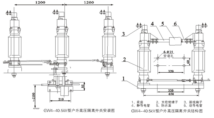 1)35kV成套隔離開(kāi)關(guān)由GW4-40.5(D)(W)型隔離開(kāi)關(guān)本體、CSⅡ、CS17或CS8-6D型人力操動(dòng)機(jī)構(gòu)、傳動(dòng)附件等組成,也可配用CJ6型等電動(dòng)機(jī)構(gòu)。110kV成套隔離開(kāi)關(guān)由GW4-126(D)(W)型隔離開(kāi)關(guān)本體、CS14G人力操動(dòng)機(jī)構(gòu)、傳動(dòng)附件等組成,也可配用CJ6型等電動(dòng)機(jī)構(gòu)。 2) 該隔離開(kāi)關(guān)屬雙柱水平開(kāi)啟式隔離開(kāi)關(guān)。制成單極型式,當(dāng)三極同步使用時(shí),極間用連接桿連接起來(lái)。各單級(jí)都由基座、支柱絕緣子、出線座及觸頭等部分組成,兩支柱絕緣瓷瓶相互平行地安裝在基座兩端地軸承上,且與基座垂直。主導(dǎo)電部分分別安裝在兩支柱絕緣瓷瓶上方,隨支柱絕緣瓷瓶作約90°轉(zhuǎn)動(dòng)。 3)隔離開(kāi)關(guān)的每個(gè)軸承座內(nèi)裝有軸裝配,兩軸裝配間通過(guò)連扳、調(diào)節(jié)螺桿等連接傳動(dòng)。 4)出線座中的紫銅編織帶軟連接分別緊固在導(dǎo)電桿和接線板上,接線板供用戶連接路之用。 5)中間觸頭部分的觸指稱為裝配,采用外壓式或自力型觸指,其形式為轉(zhuǎn)入式,以減少分、合閘時(shí)觸頭與觸指間的磨損,提高使用壽命。 6)隔離開(kāi)關(guān)附有接地開(kāi)關(guān)時(shí),主導(dǎo)電回路與接地開(kāi)關(guān)的聯(lián)鎖用基座上的扇形板與弧形板保證,在 主導(dǎo)電回路合閘時(shí),接地開(kāi)關(guān)不可合閘,接地開(kāi)關(guān)合閘時(shí),主導(dǎo)電回路不可合閘。配用CS8-6D或CS17-Ⅱ型時(shí)隔離開(kāi)關(guān)與接地開(kāi)關(guān)聯(lián)鎖由機(jī)構(gòu)上的連鎖板實(shí)現(xiàn)。 |
