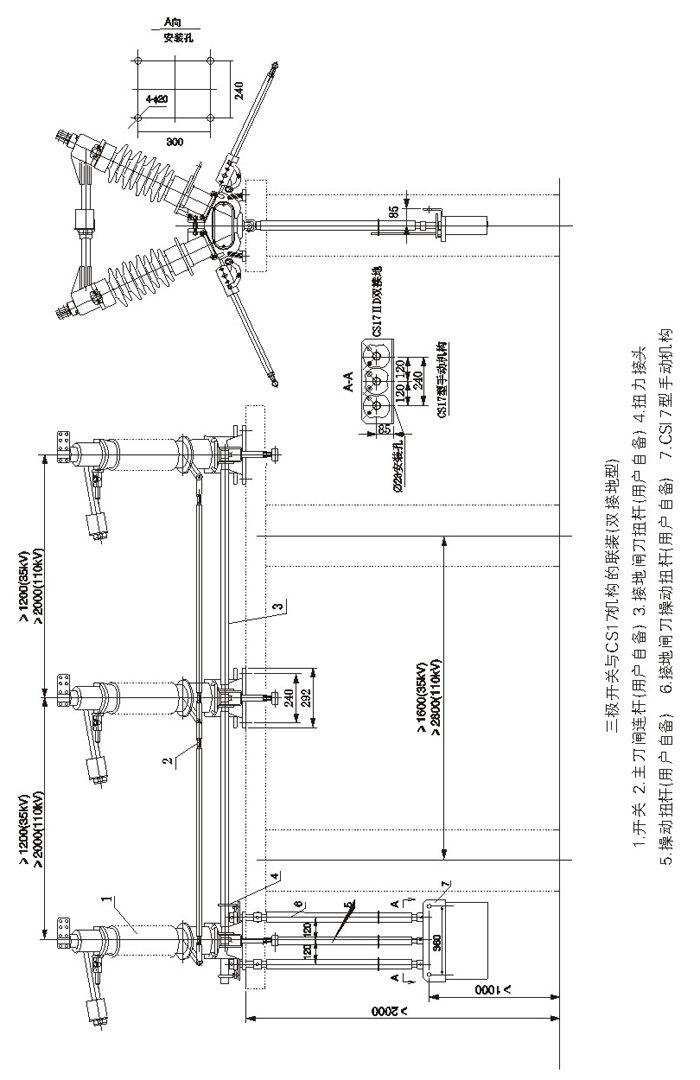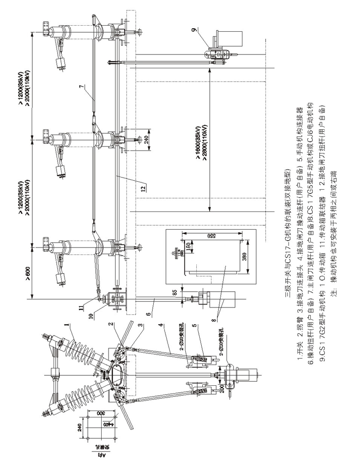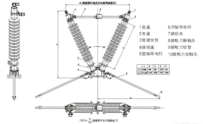 1)本產(chǎn)品為雙柱水平斷口中間開(kāi)啟式,可以一側(cè)或兩側(cè)附裝接地開(kāi)關(guān)。90°傳動(dòng)的隔離開(kāi)關(guān)采用CS17型人力操作機(jī)構(gòu)進(jìn)行三極聯(lián)動(dòng)操作;180°傳動(dòng)的隔離開(kāi)關(guān)采用CJ6型電動(dòng)機(jī)操作機(jī)構(gòu)或CS17G型人力操作機(jī)構(gòu)進(jìn)行三極聯(lián)動(dòng)操作;接地開(kāi)關(guān)采用CS17G型人力操動(dòng)機(jī)構(gòu)三極聯(lián)動(dòng)操作. 2)隔離開(kāi)關(guān)屬雙柱V形水平開(kāi)啟式,各單級(jí)都由基座、支柱絕緣子、出線座及觸頭等部分組成,由50°夾角的兩個(gè)支座、兩支柱絕緣子相互夾角地安裝在基座兩端地軸承上,且與基座垂直。主導(dǎo)電部分分別安裝在兩支柱絕緣瓷瓶上方,隨支柱絕緣瓷瓶作約90°轉(zhuǎn)動(dòng)。 3)出線座中的紫銅編織帶軟連接分別緊固在導(dǎo)電桿和接線板上,接線板供用戶連接線路之用。 4)中間觸頭部分的觸指成對(duì)裝配,采用外壓式或自力型觸指,其形式為轉(zhuǎn)入式,以減少分、合閘時(shí)觸頭與觸指間的磨損,提高使用壽命。 5)隔離開(kāi)關(guān)附有接地開(kāi)關(guān)時(shí),主導(dǎo)電回路與接地開(kāi)關(guān)的聯(lián)鎖用基座上的扇形板與弧形板保證,在主導(dǎo)電回路合閘時(shí),接地開(kāi)關(guān)不可合閘,接地開(kāi)關(guān)合閘時(shí),主導(dǎo)電回路不可合閘。 |