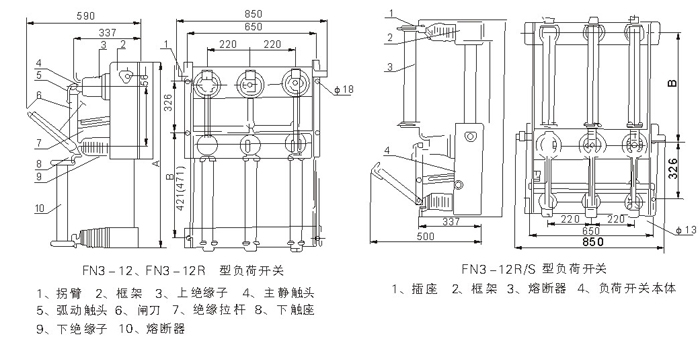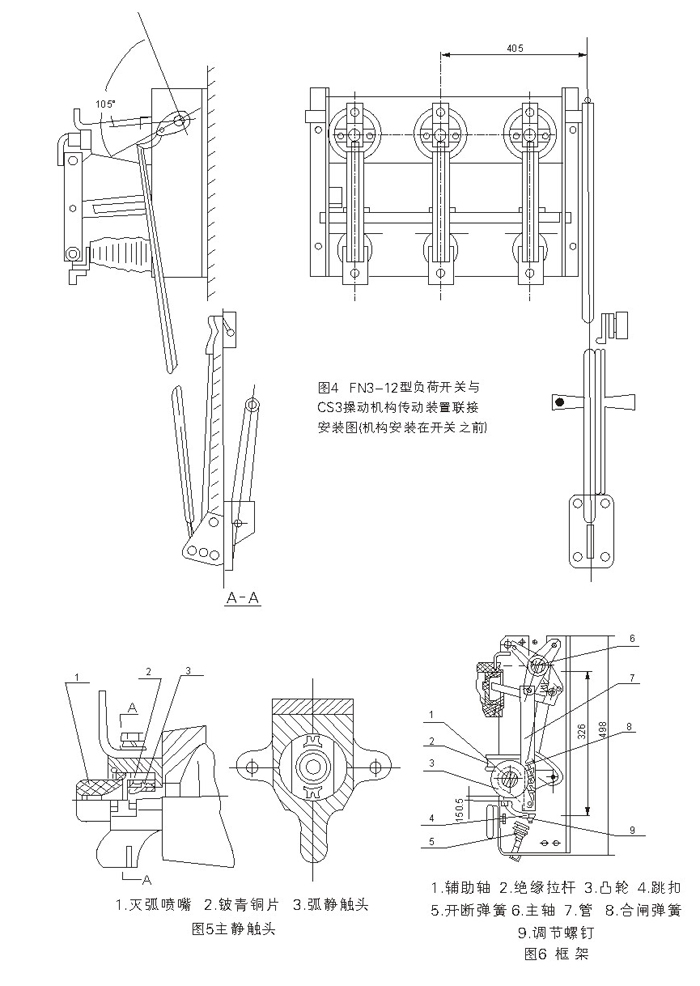 | FN3-10型戶內(nèi)負(fù)荷開(kāi)關(guān)的外形與一般戶內(nèi)隔離開(kāi)關(guān)相似(圖1)開(kāi)關(guān)的底部為框架2,傳動(dòng)機(jī)構(gòu)裝于其中。框架上裝有六只絕緣子,上部的三只絕緣子3兼作支持件與氣缸之用,活塞裝于其內(nèi),由主軸帶動(dòng),下部的三只絕緣子僅起支持作用。上、下絕緣子上均裝有觸座。導(dǎo)電部分由閘刀與觸座組成,閘刀6與下觸座8之間靠六片形彈簧片因緊,在閘刀的端部裝有弧動(dòng)觸頭5,上觸座4為主靜觸頭。 | ||||||||||||||||||||||||||||||||||||||||||||||||